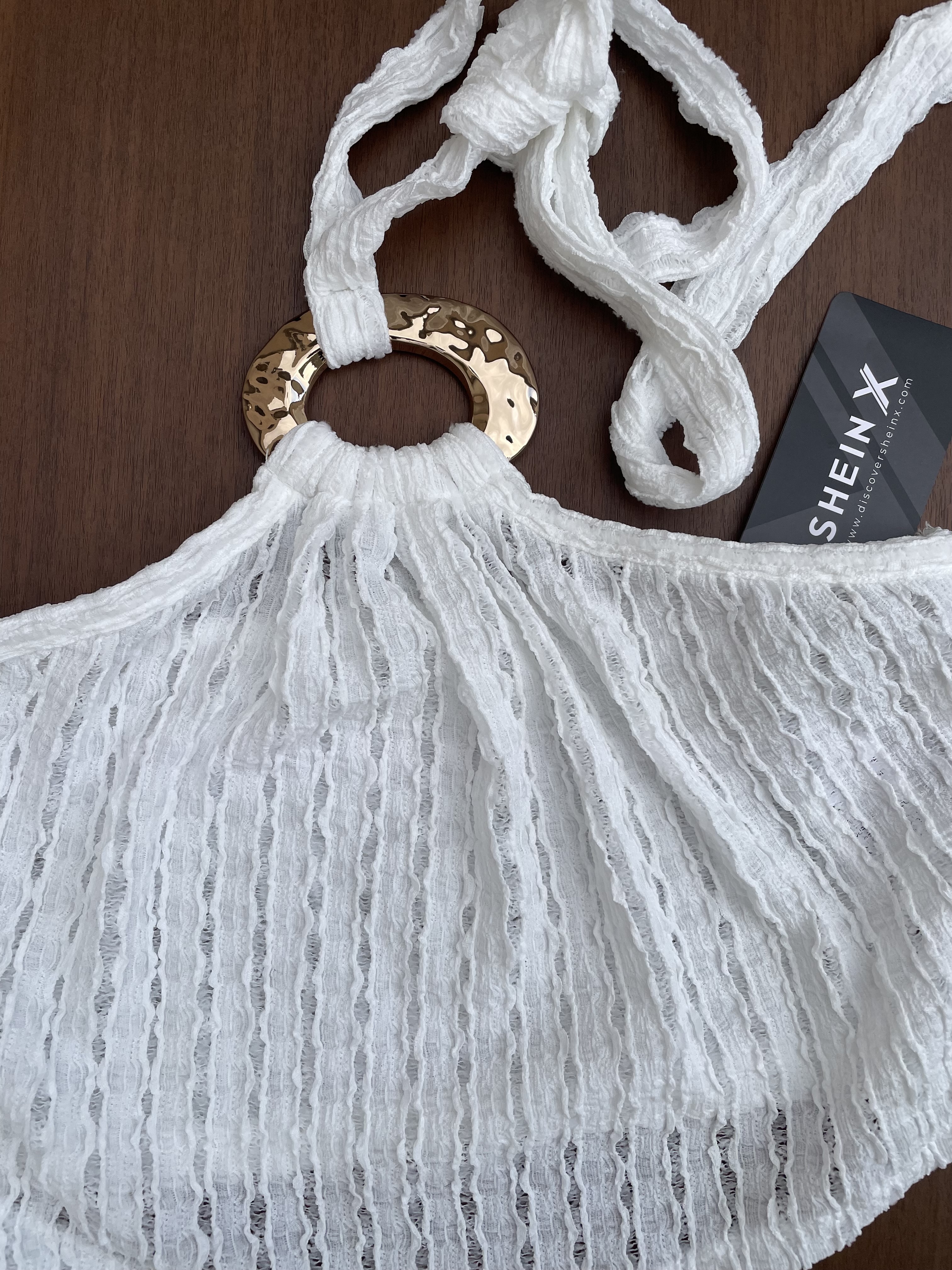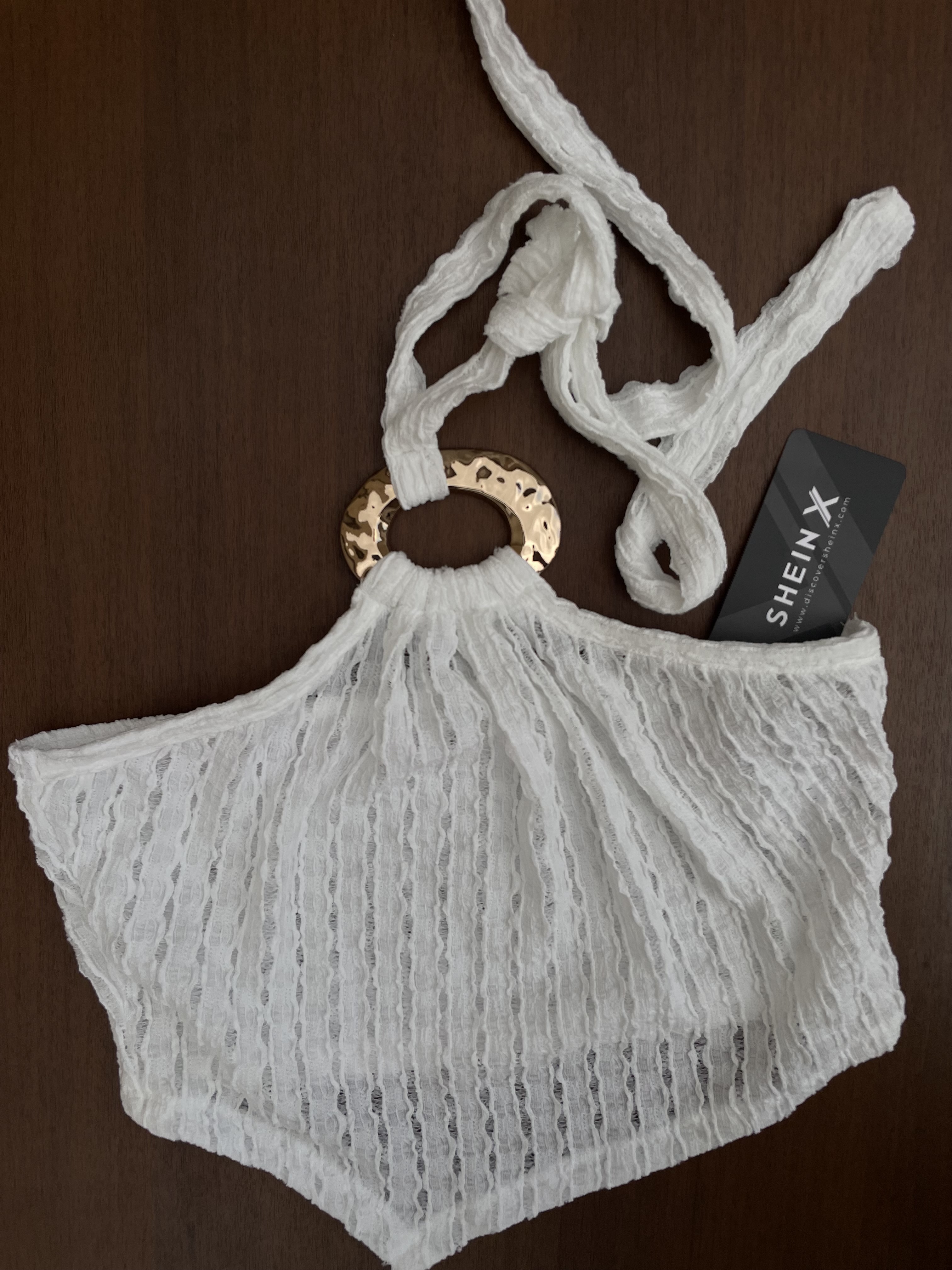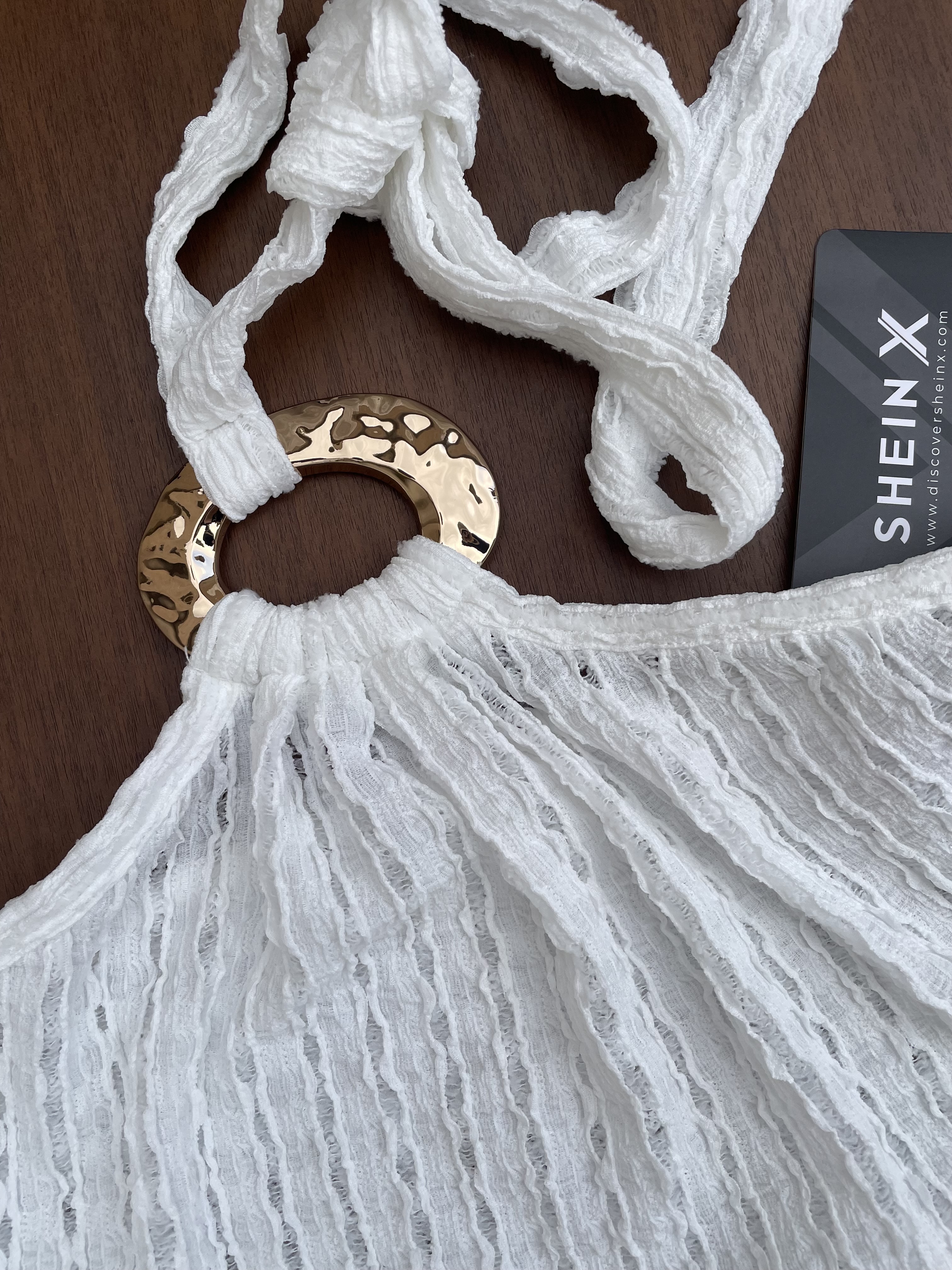 تایپ هالتر کراپ با اکسسوری طلایی برند SHEIN .تاپ شیک و مدرن با پارچه لطیف طراحی شده برای استایل های کژوال و تعطیلات انتخاب ایده الی است . بند های گره ای و حلقه طلایی در قسمت جلو یقه ، جلوه ای خاص به این الو بخشیده و طراحی نامتقارن پایین آن ، استایل شما را متفاوت میکند .پارچه نرم و کشیدن این کراپ ، راحتی و تنفس پذیری بالایی را در روزهای گرم فراهم میکند .