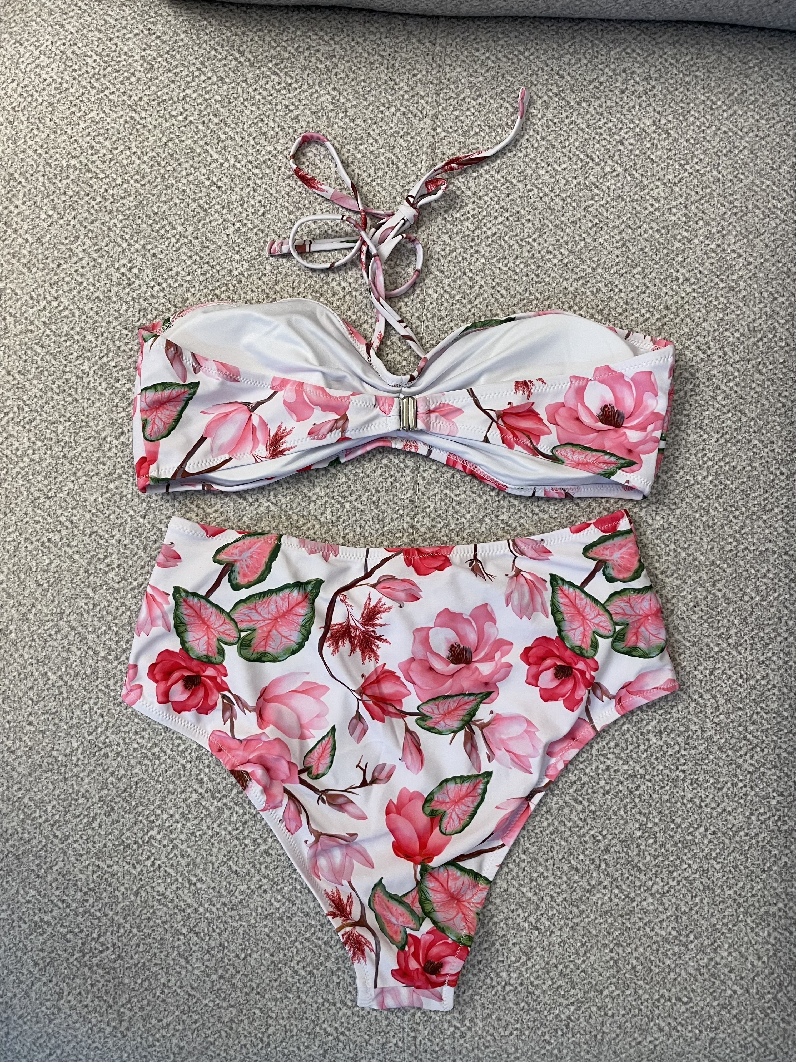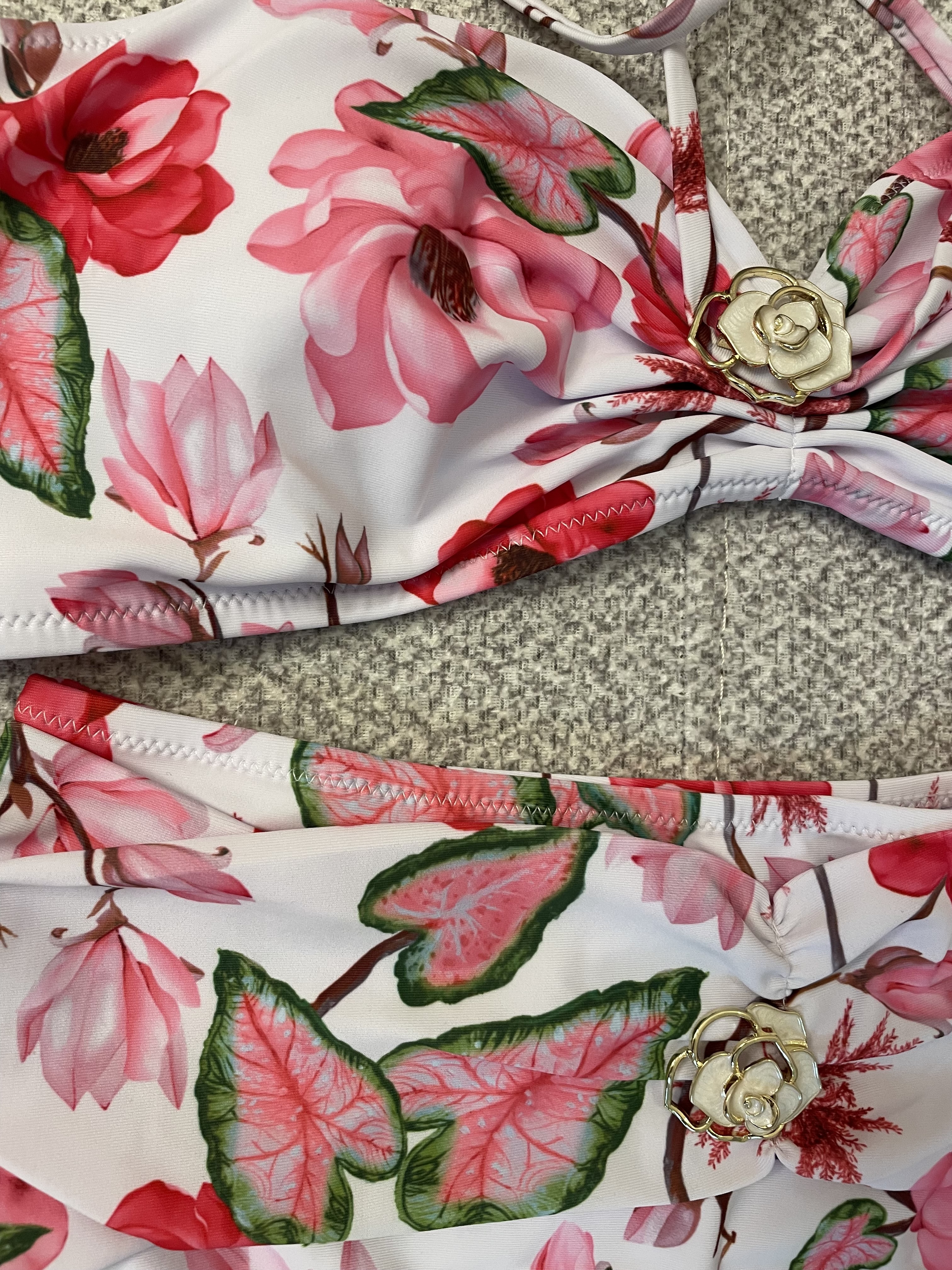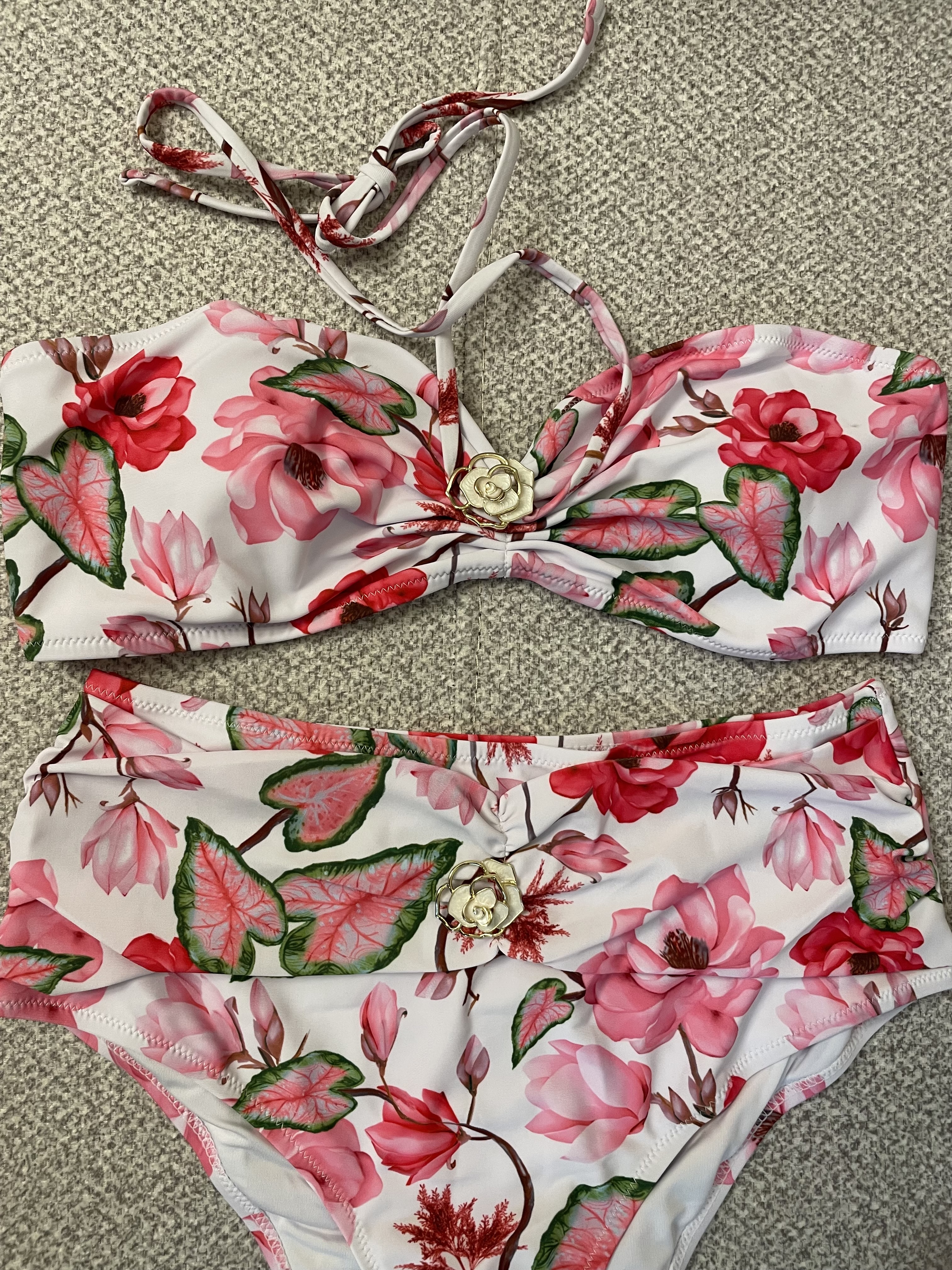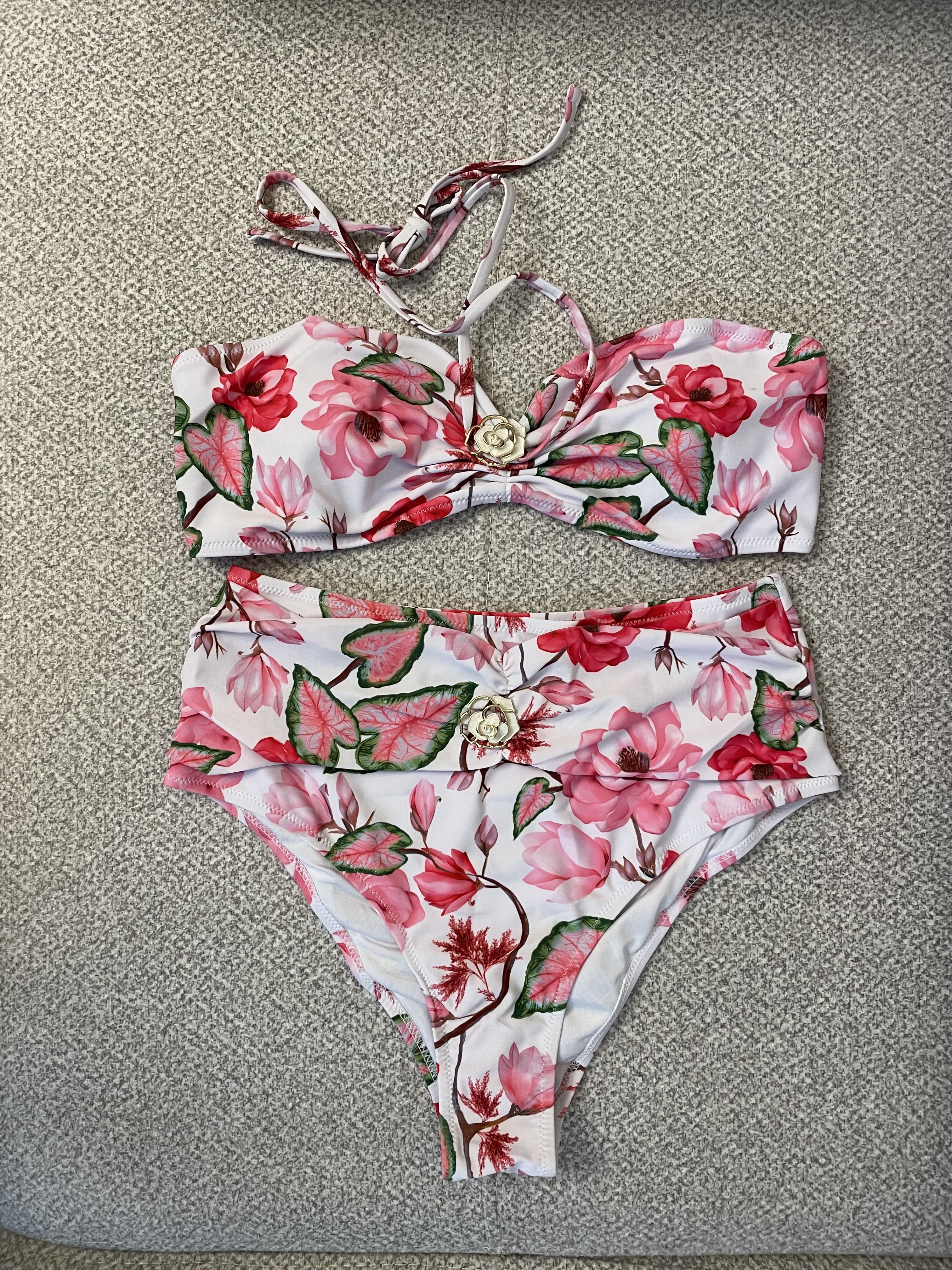 ست مایو زنانه دوتکه بندی بدون شانه با طرح گلدار و گل طلایی تزئینی کد214