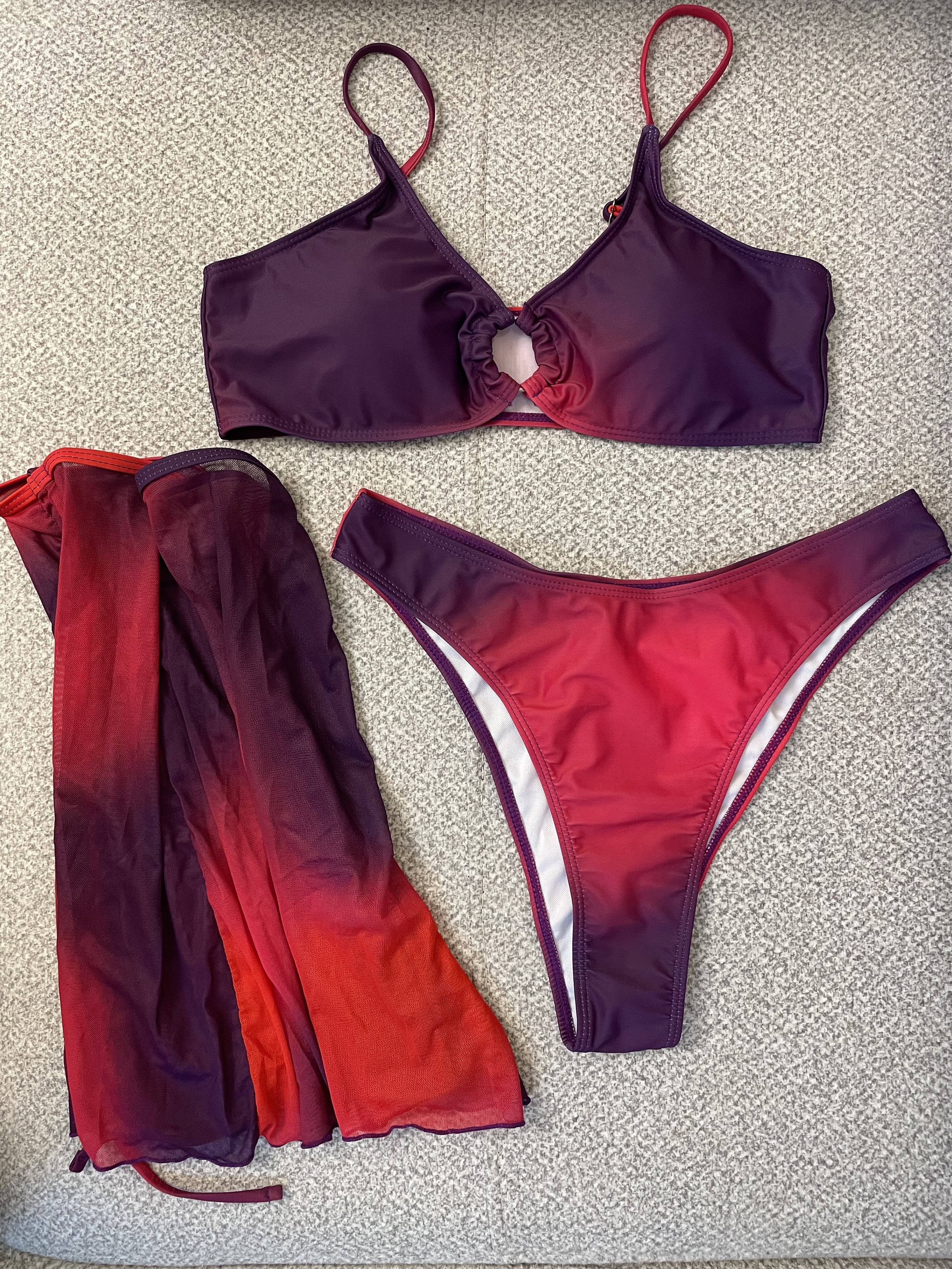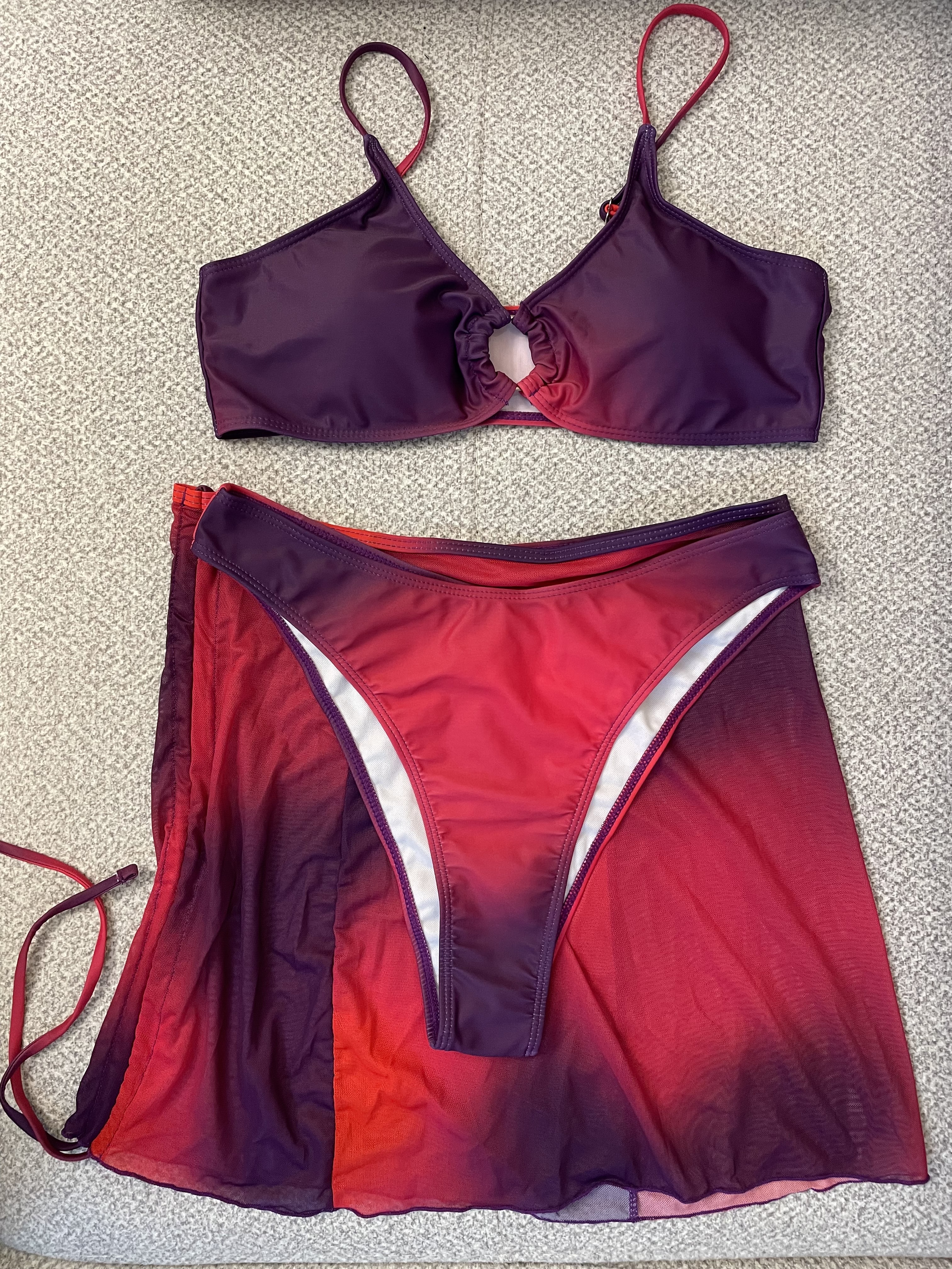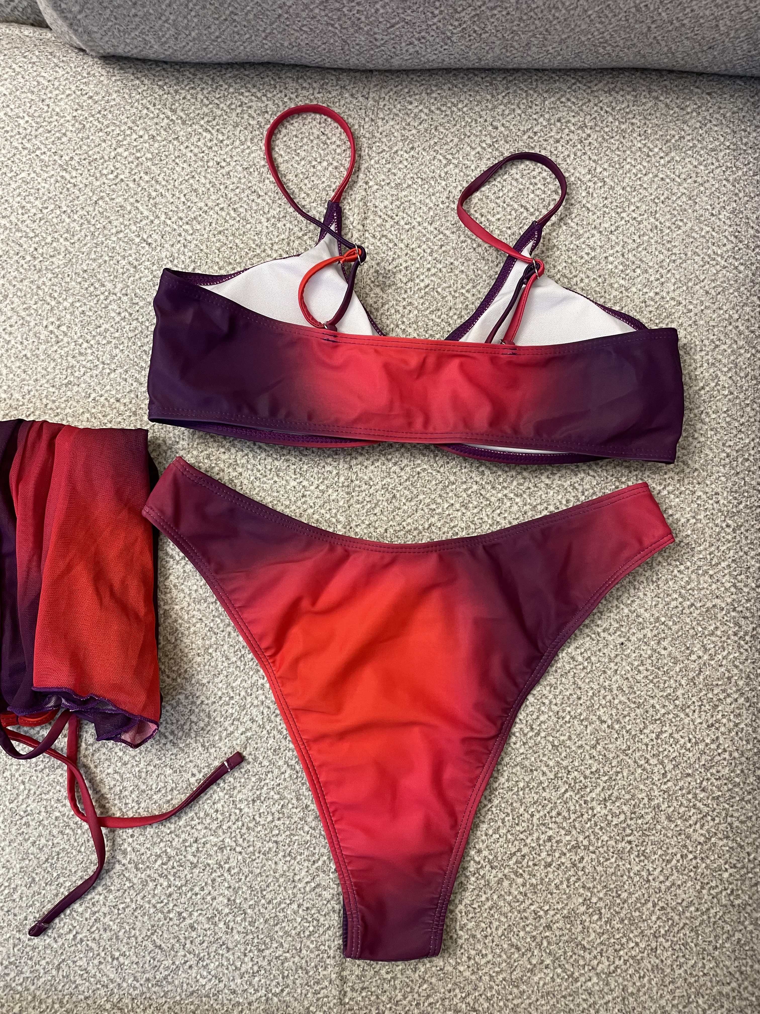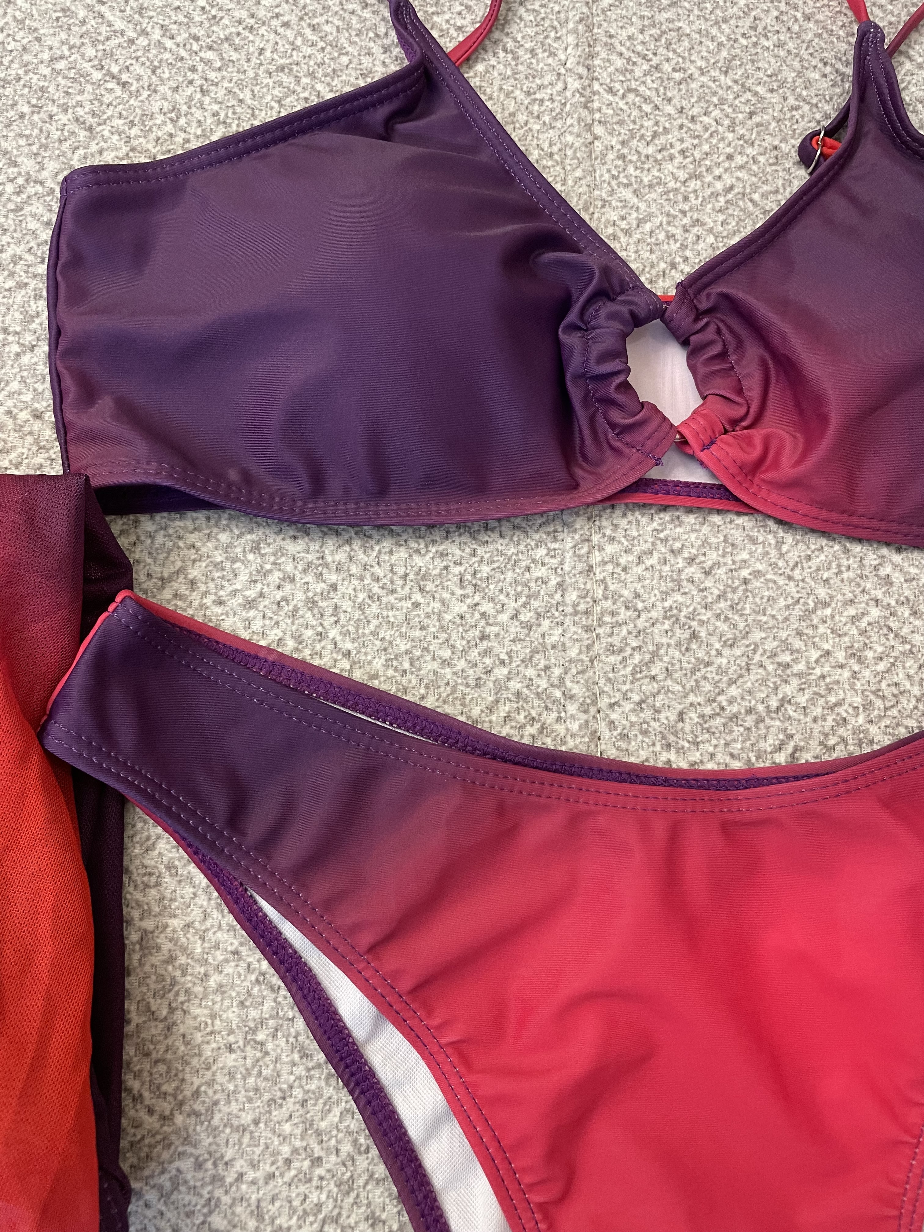 ست مایو سهتکه زنانه گرادینتی بنفش-قرمز با دامن تور برند shein کد215