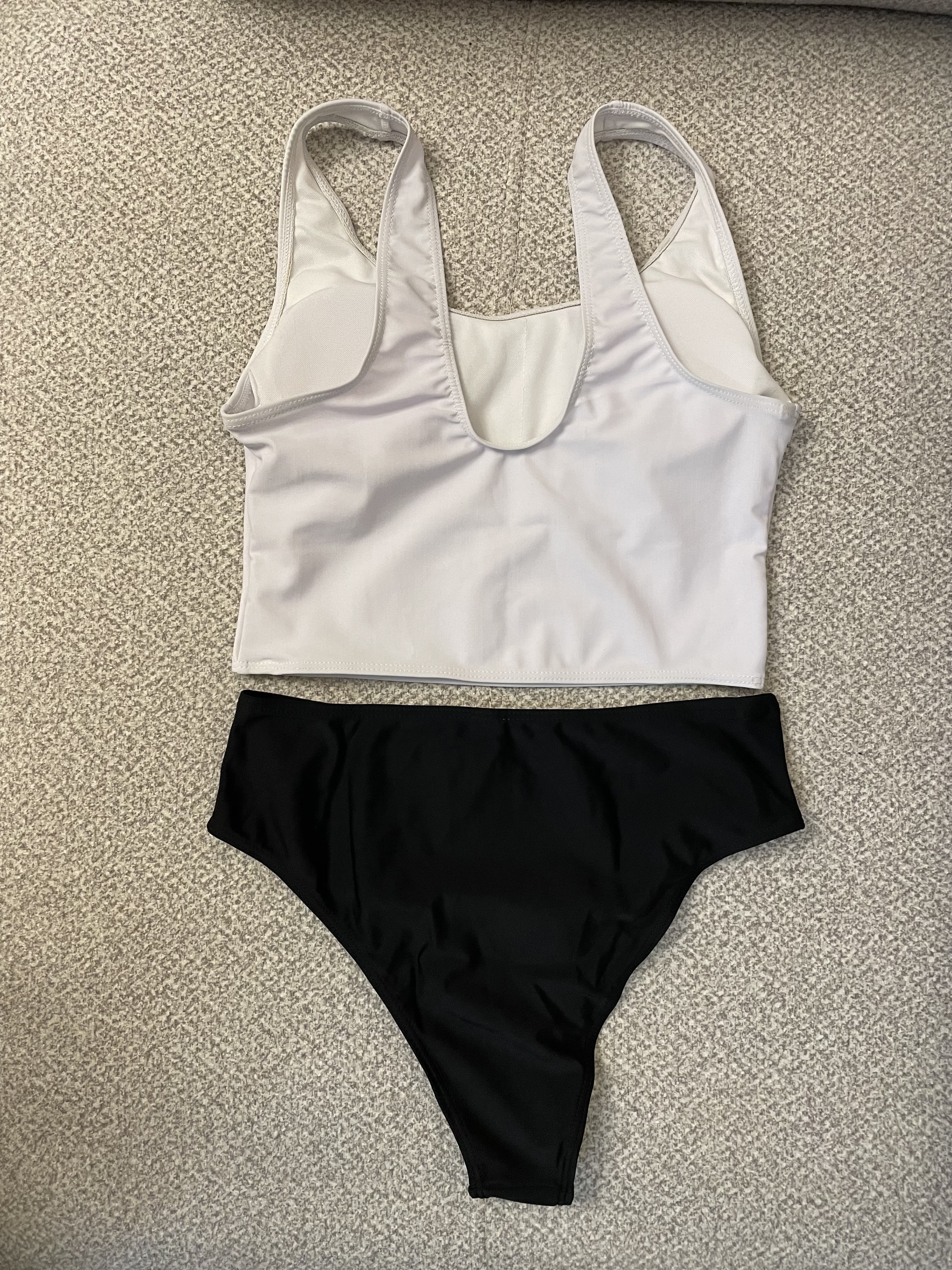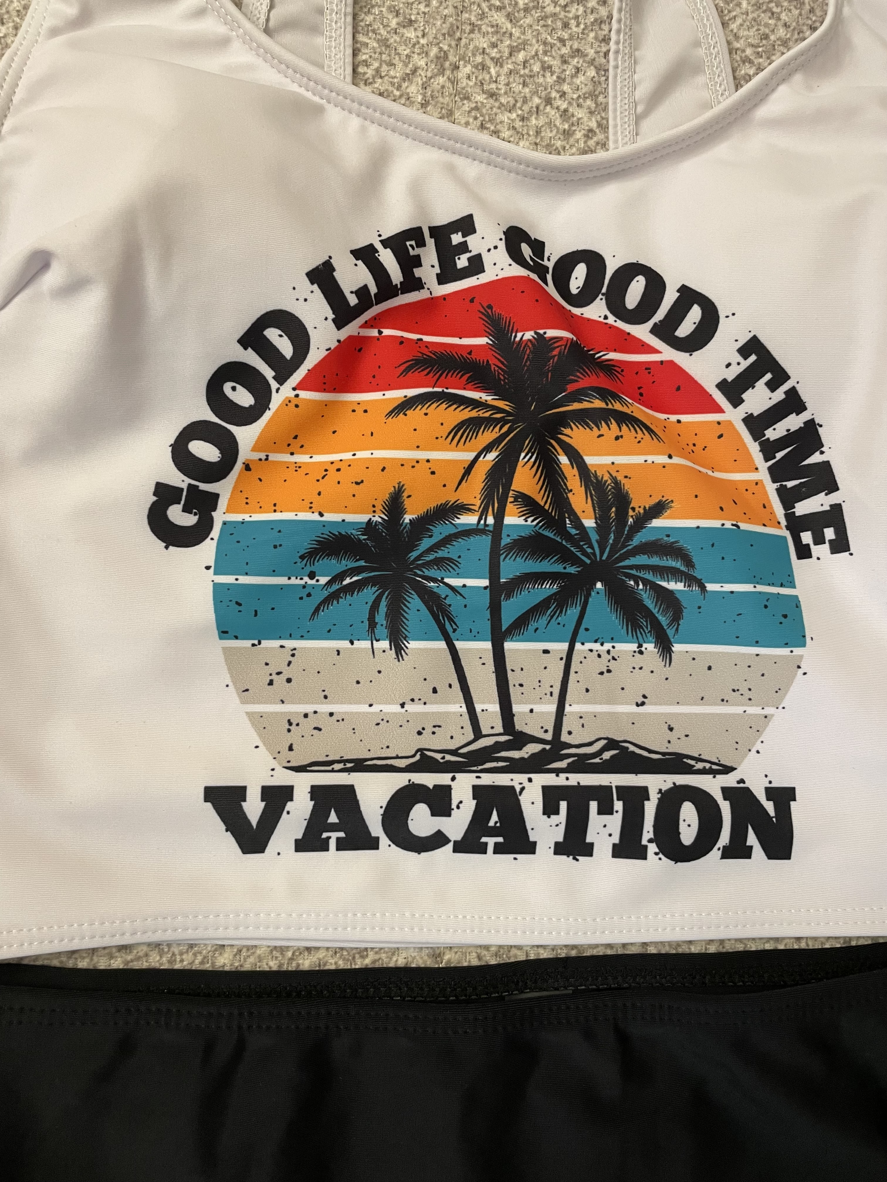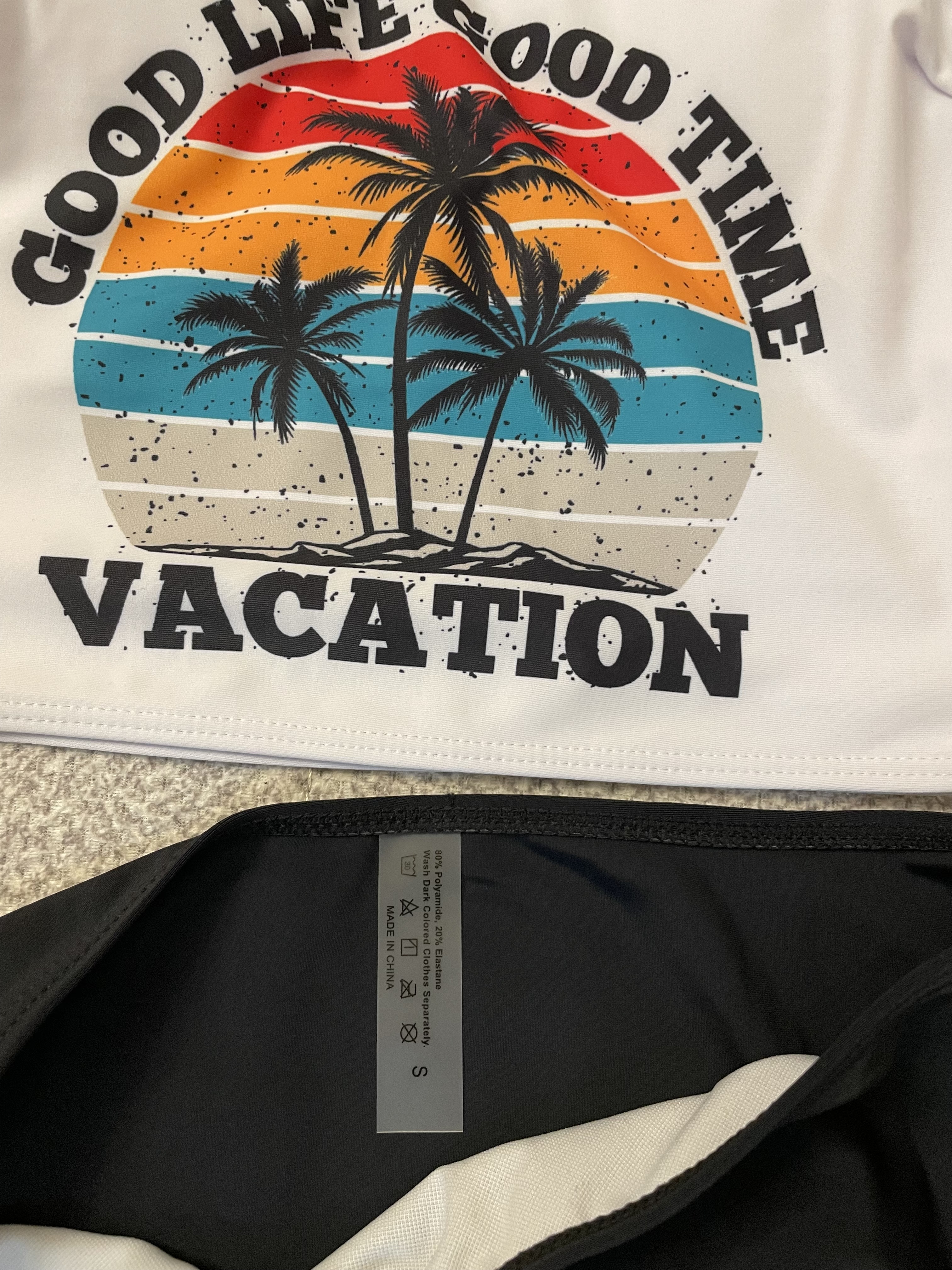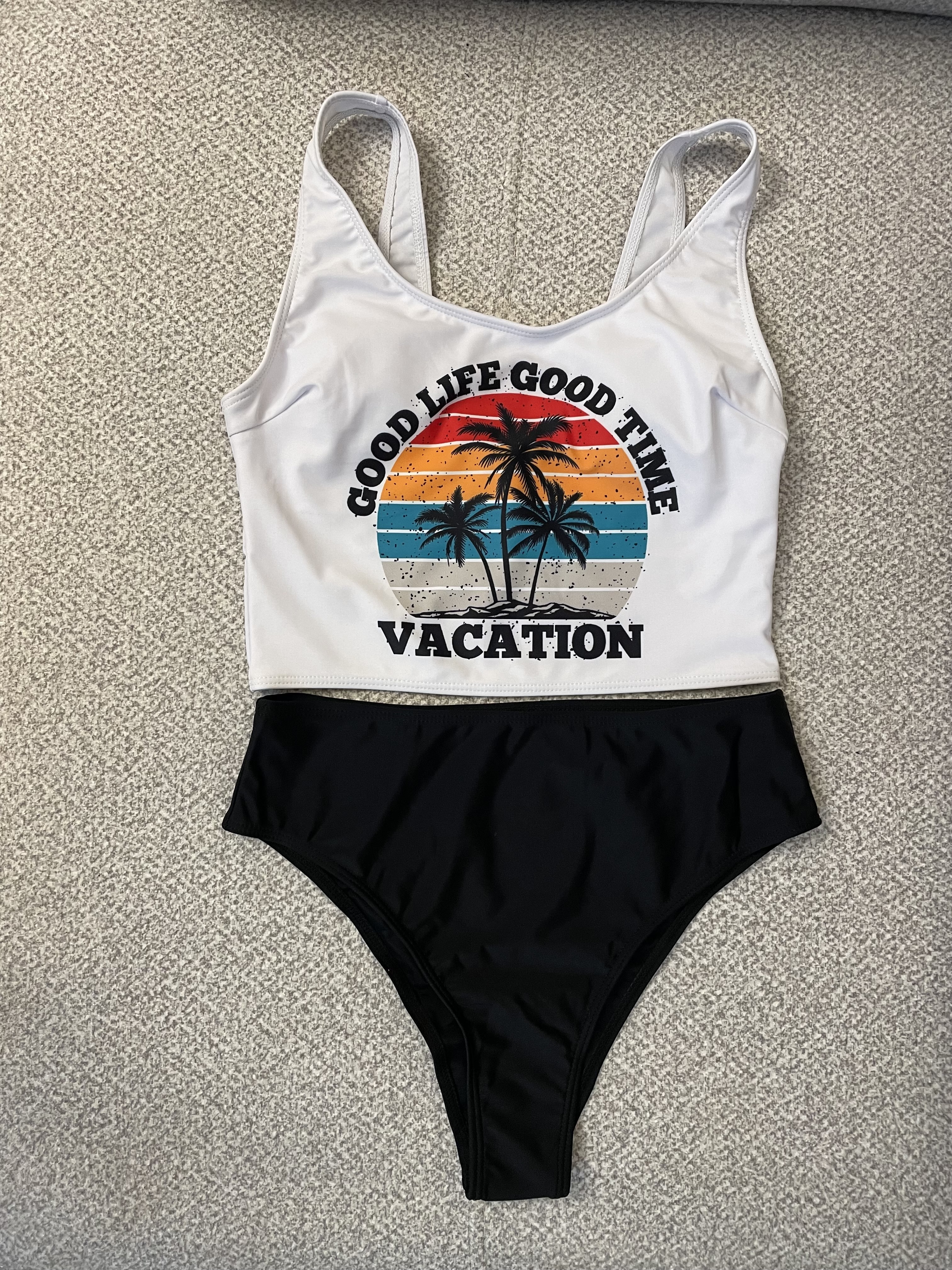 مایو دوتیکه زنانه از برند شین ،انتخابی ایده ال برای تعطیلات ساحلی و روزهای گرم تابستانی! این ست شامل یک تاپ سفید با طراحی گرافیکی جذاب و یک شورت مشکی با کمر بلند است.طرح روی تاپ با نخل ها و غروب خورشید در رنگهای گرم حس سرزندگی وآرامش تعطیلات را به شما هدیه می دهد. مناسب برای شنا، تفریحیات ساحلی
