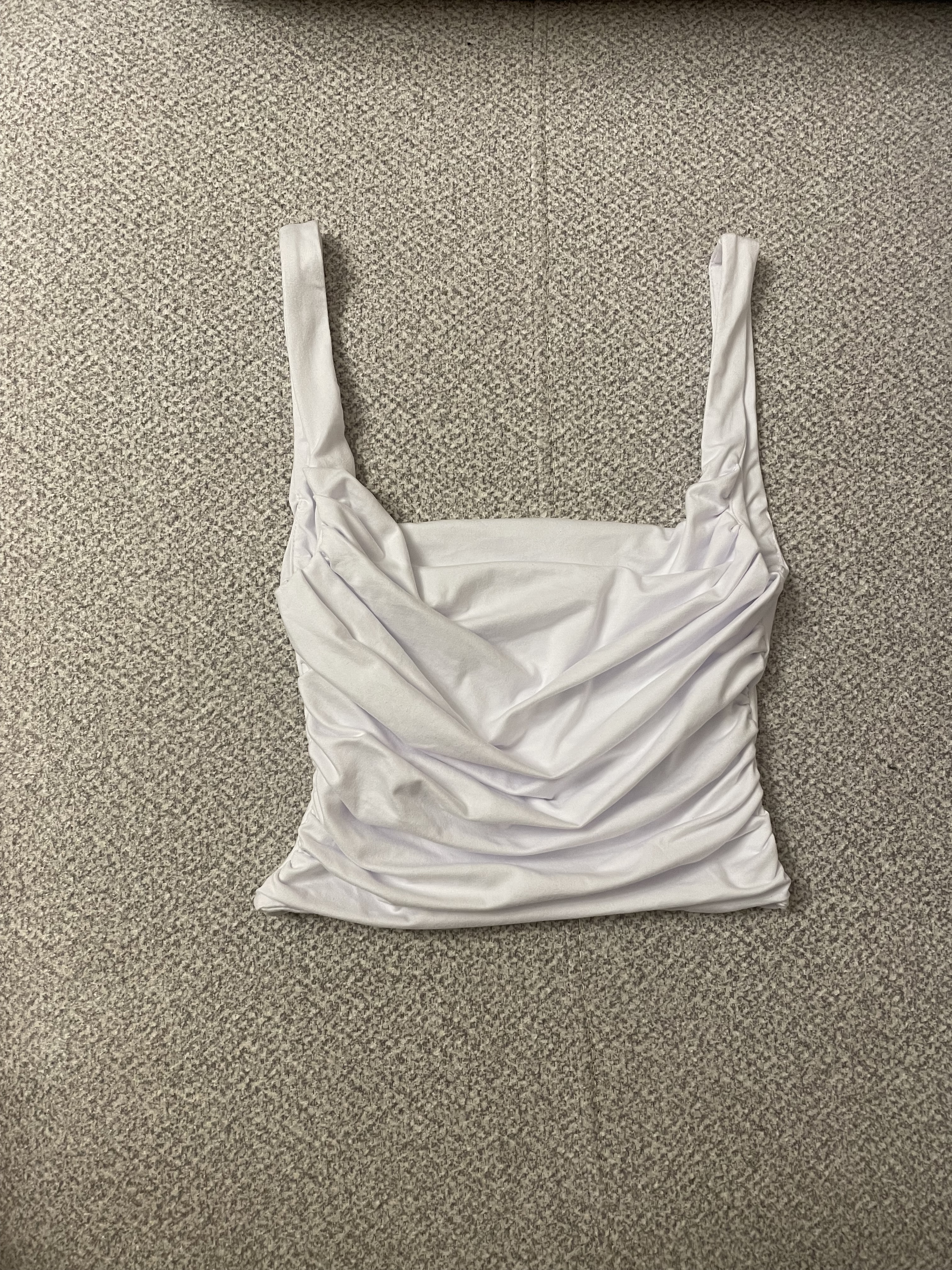 این تاپ زنانه کوتاه سفید یا طراحی شیک و مینیمال گزینه ای ایده ال برای استایل روزمره و مدرن شماست. پارچه نرم و انعطاف پذیر با چین های ظریف در قسمت جلویی، جلوه ای خاص و جذاب به لباس می بخشه. طراحی بدون آستین و یقه مربعی این تاپ، آن رو برای ترکیب با شلوار جین، دامن یا لگ مناسب می کنه و به خصوص در فصل های گرم به کار میاد. این محصولبا راحتی بالا، انتخابی عالی برای مهمانی های غیررسمی و استایل کژوال هست.