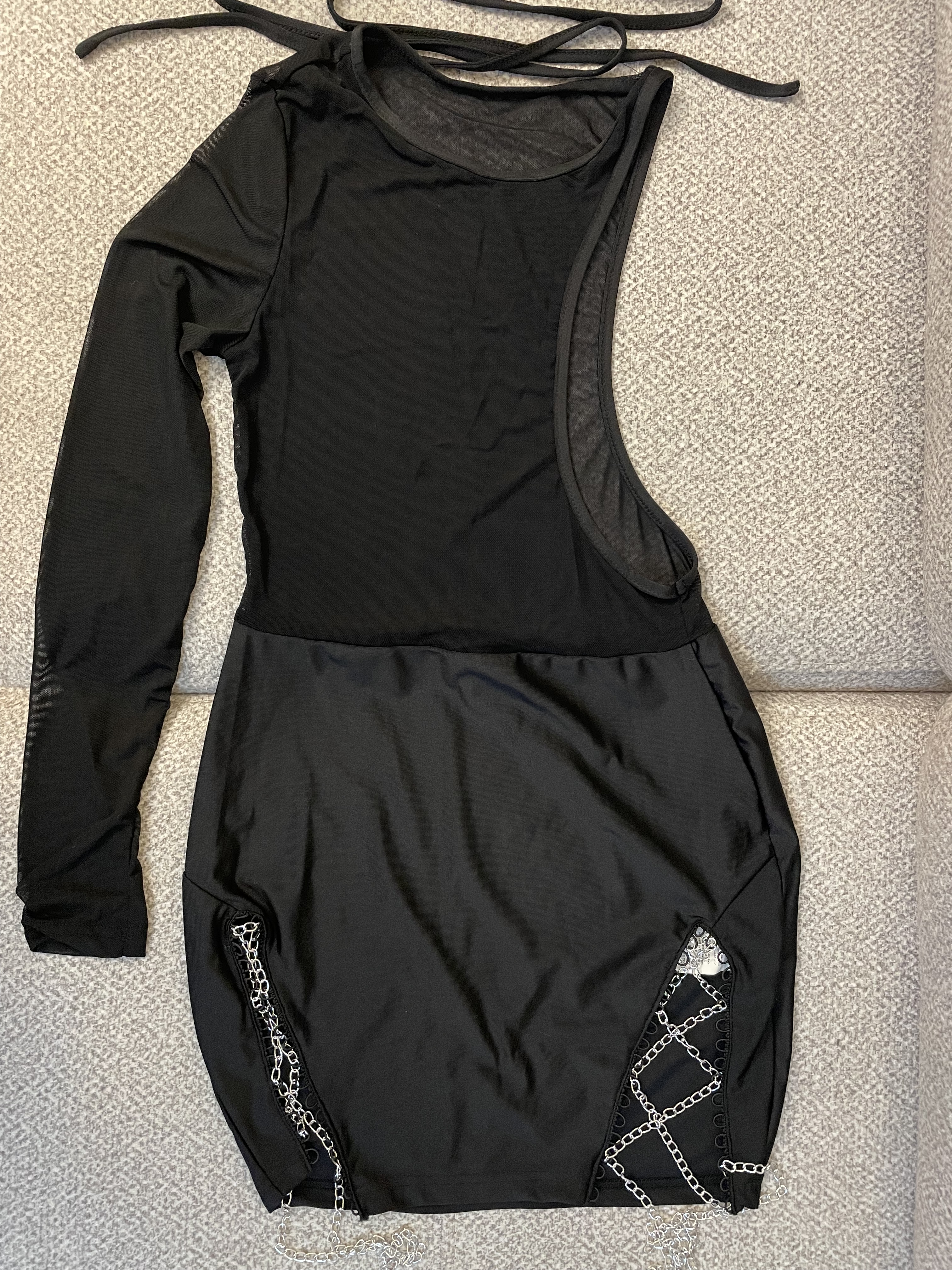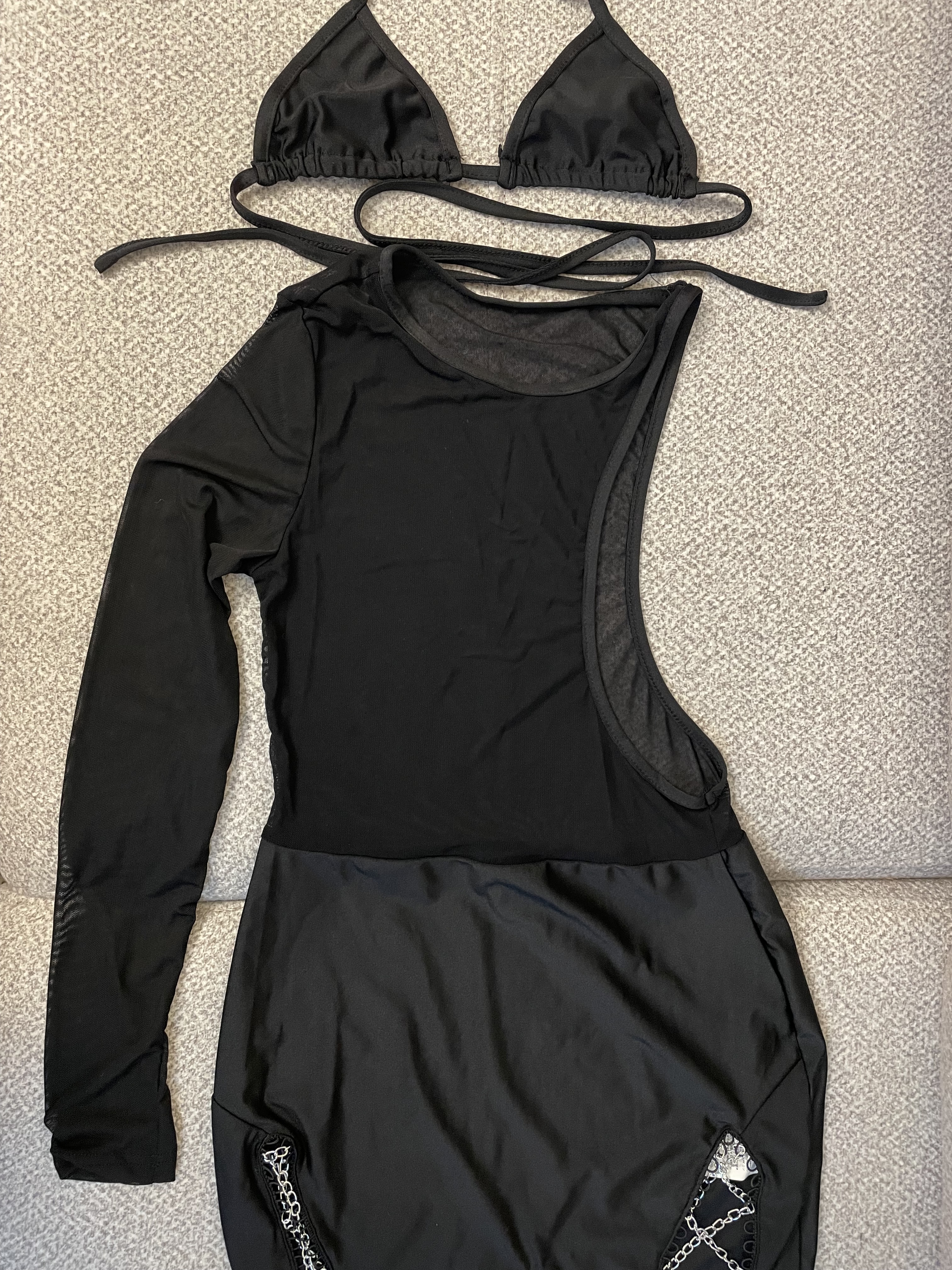 این ست شیک وجذاب شامل یک لباس مشکی بلند آستین با طراحی مدرن و یک بالاتنه بیکینی هم رنگ است که برای مهمانی ها و موقعیت های خاص طرحی شده است. لباس دارای برش های خلاقانه در قسمت شانه و کمر است که ظاهری جسورانه و امروزی به آن می بخشد. جزئیات زنجیری تزئینی در قسمت پایین لباس ، جلوه ای متفاوت و لوکس به این محصول اضافه کرده است. جنس پارچه ترکیبی از مواد باکیفیت و کشتان است که راحتی و تن خور عالی را تضمین می کند.بیکینی بالاتنه نیز با طراحی ساده و شیک ، مکمل این لباس بوده و برای استفاده در ست های مختلف مناسب است.